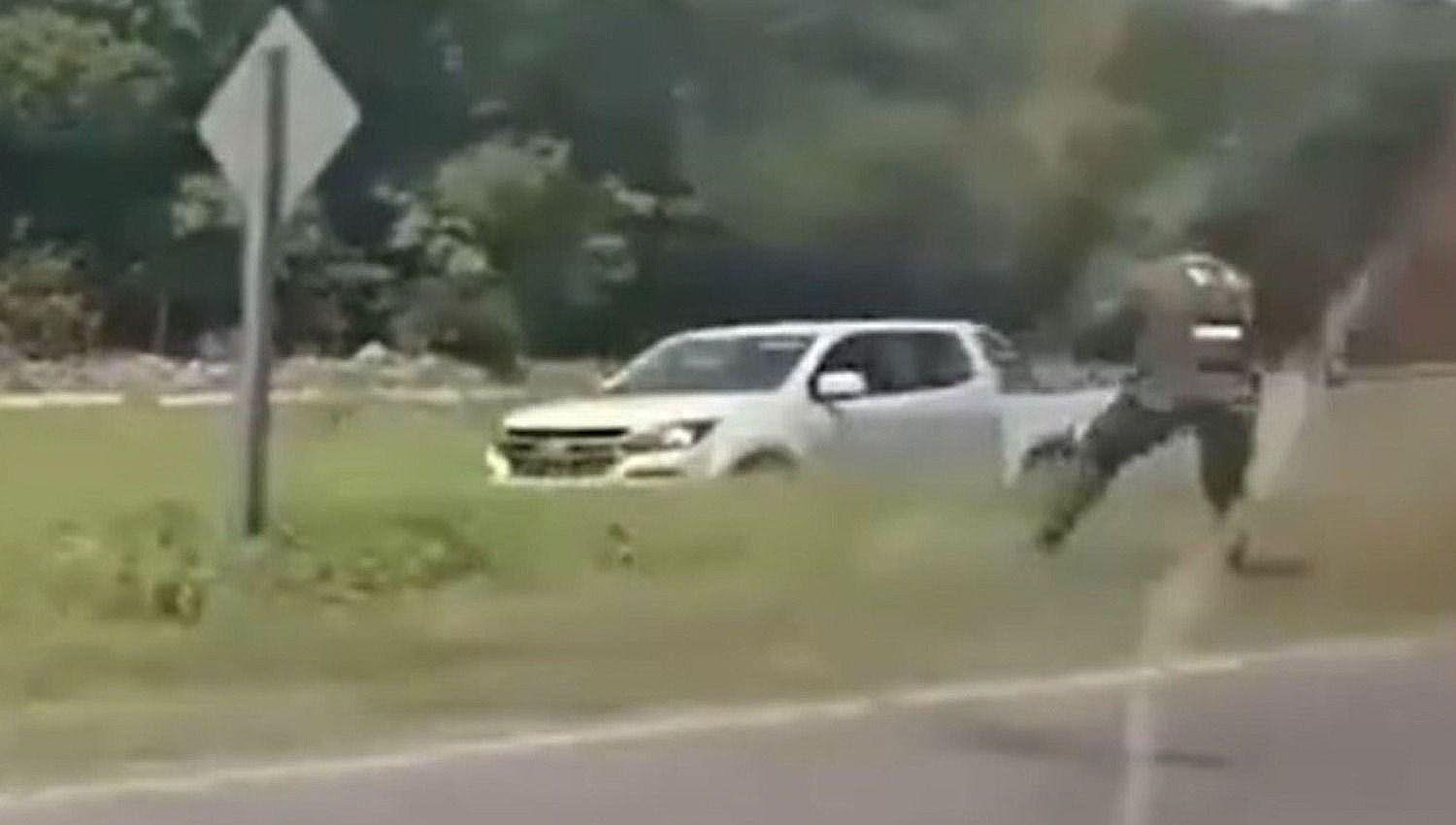 Entonces se ve a un uniformado disparar varias veces hacia la camioneta blanca, que no detiene su marcha y logra escapar.