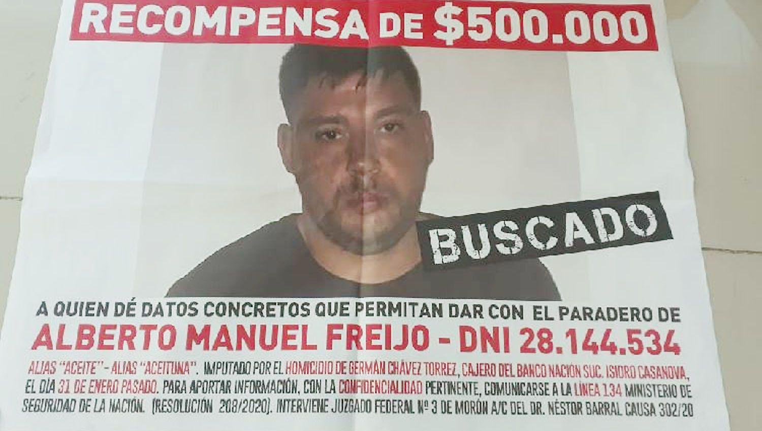 Alberto Manuel Freijo, apodado "Aceite", uno de los dos prófugos más buscados de la Argentina por el homicidio de un cajero de la sucursal bonaerense de Isidro Casanova del Banco Nación Argentina (BNA), en un asalto hace dos años, fue detenido hoy herido de bala tras un enfrentamiento con la Policía, en el partido de Florencio Varela, informaron fuentes judiciales y de la fuerza.