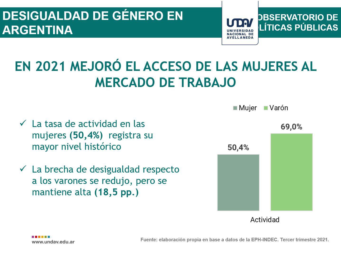 Mejoró el acceso de las mujeres al mercado laboral. La tasa de actividad en las mujeres (50,4%) registra su mayor nivel histórico. La brecha de desigualdad respecto a los varones se redujo, pero se mantiene muy elevada (18,5 pp.)
