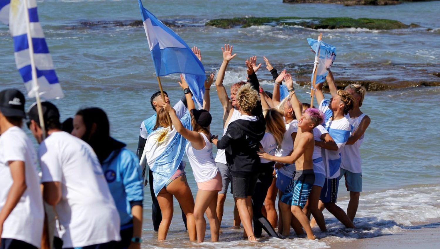 Los chicos argentinos cantan y saltan en la orilla. Abrazados, formando un ramillete humano, sosteniendo una bandera que flamean y mostrando esa pasión nacional que se transmite de generación en generación y de deporte en deporte.