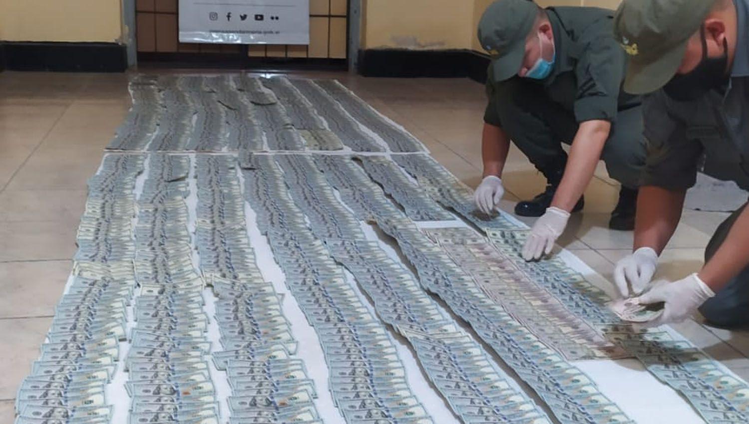 Al momento de la inspección física y documentológica del rodado, los funcionarios observaron cinco fajos de dólares estadounidenses ocultos debajo de bolsas de arpillera en la caja del rodado y más billetes dentro de la guantera, sin documentación que avale su origen lícito.