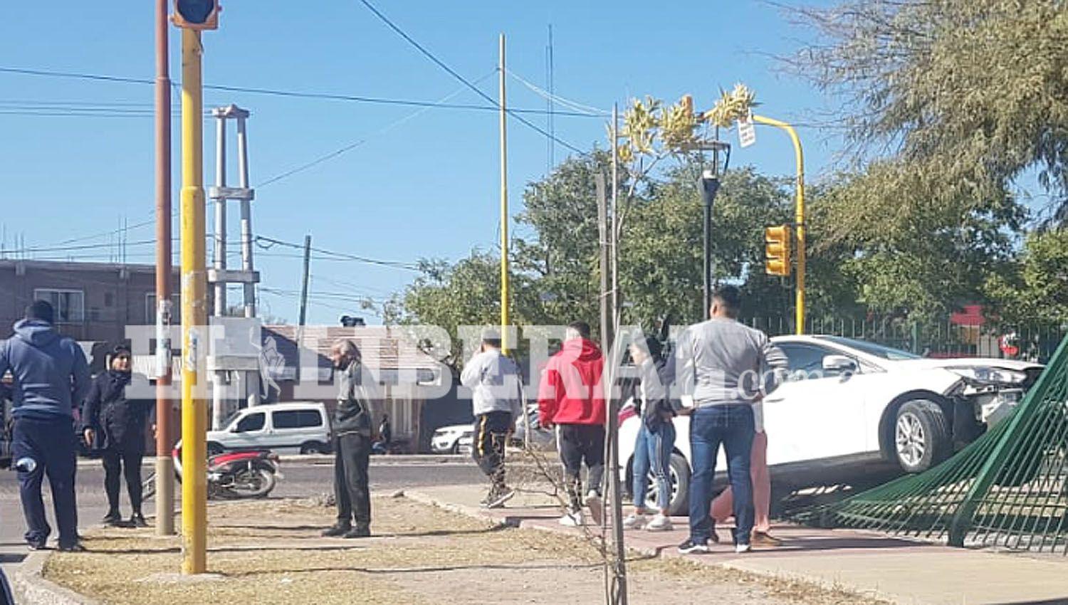Producto del accidente, el auto perdió el control, y al continuar la marcha impactó y derribó el enrejado del Parque Sur.