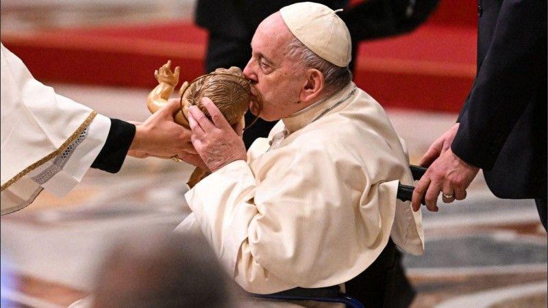 "En el pesebre del rechazo y de la incomodidad, Dios se acomoda, llega allí, porque allí está el problema de la humanidad, la indiferencia generada por la prisa voraz de poseer y consumir", agregó luego Jorge Bergoglio, de 86 años, quien se mostró notablemente recuperado de la lesión en la rodilla que el año pasado le había impedido encabezar algunas celebraciones.
