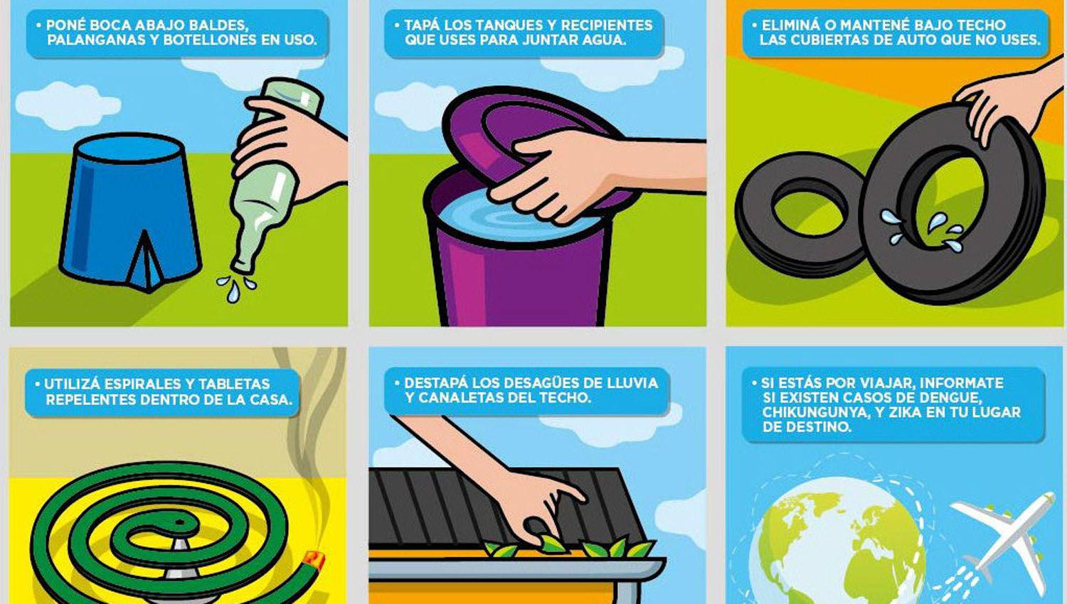 Mantener los patios y jardines desmalezados; limpiar recipientes utilizados para almacenar agua; no atar botellas a árboles y canteros; mantener limpias, cloradas o vacías las piletas de natación, fuera de la temporada.