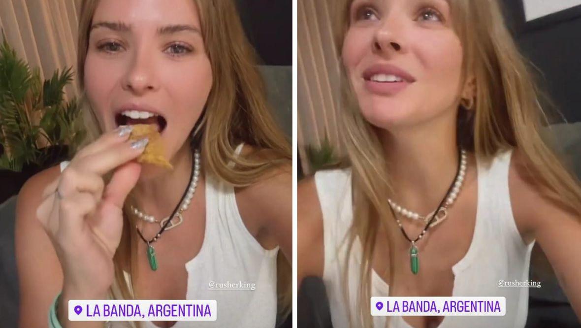 La talentosa actriz pisó suelo santiagueño ayer al mediodía y más tarde compartió en sus historias de Instagram varios videos, mientras probaba empanadillas y moroncitos que fueron un regalo de su suegra.