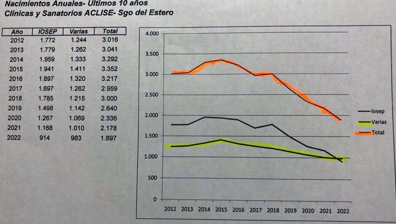 "Esa estadística está dividida por años, los últimos 10 años desde el 2012 al 2022. Se ha dividido por un lado al Iosep que es la obra social provincial, la más importante por volumen de facturación y cantidad de afiliados, y la que llamamos varios que serían el resto de las obras sociales sindicales; y eso nos da un total. En nacimientos anuales incluimos partos y cesáreas", explicó.