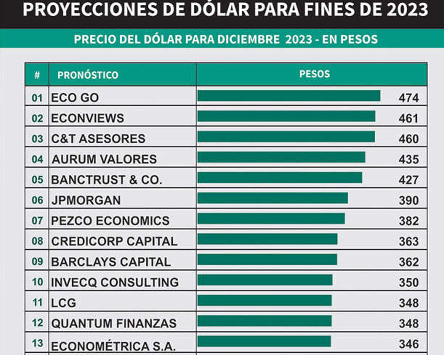 Si bien el precio de dólar consensuado para fin de diciembre es $343, los pronósticos más alarmistas para el precio del dólar oficial mayorista llegan hasta los $474, que es encabezada por la consultora Eco Go. Luego se ubican Econviews ($461), C&T Asesores ($460) y Aurum Valores, con $435.