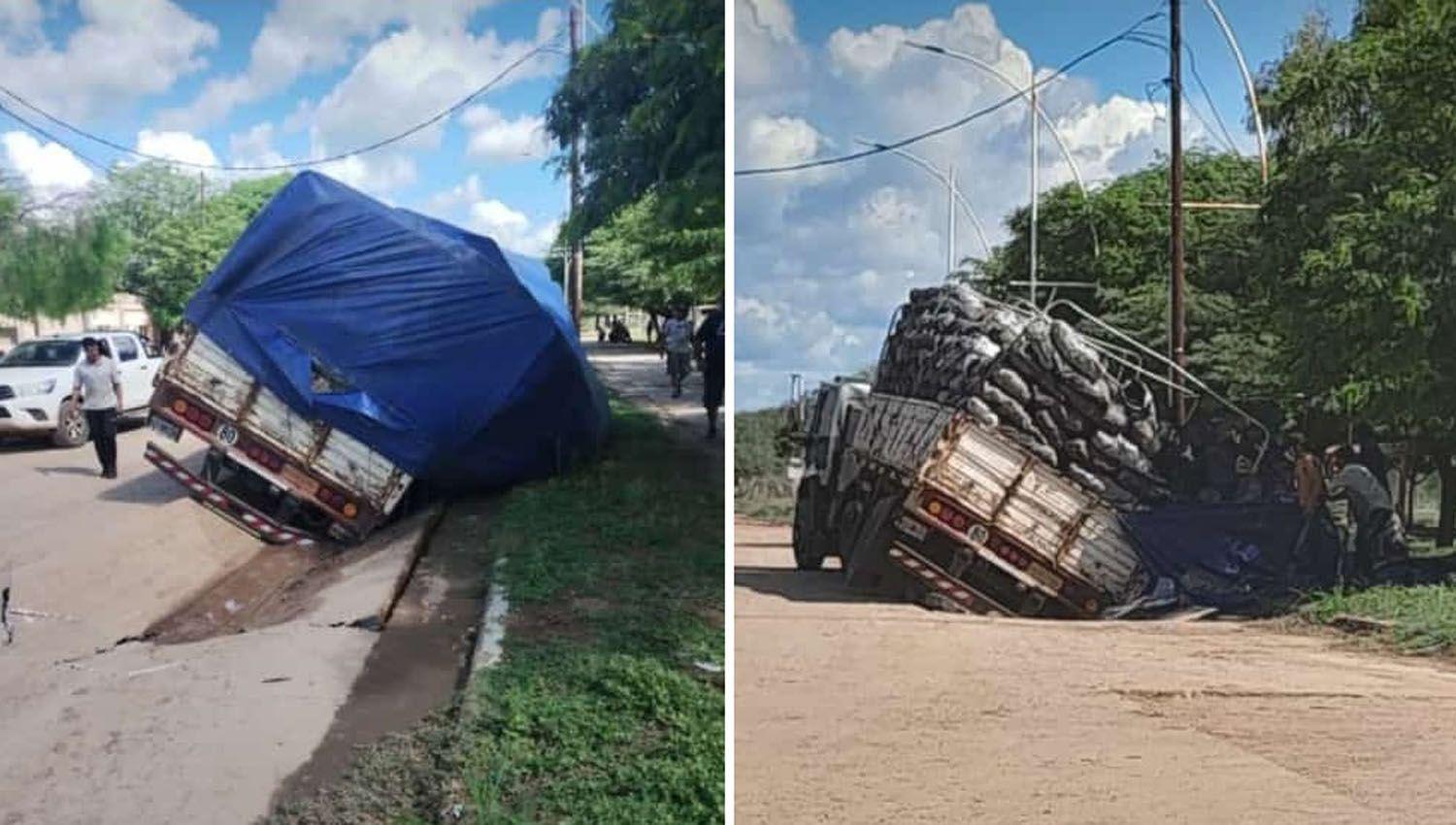 Un insólito hecho tuvo lugar este jueves en la ciudad de Vilelas, donde un camión, cargado con carbón, terminó volcado porque cedió el piso donde estaba estacionado.