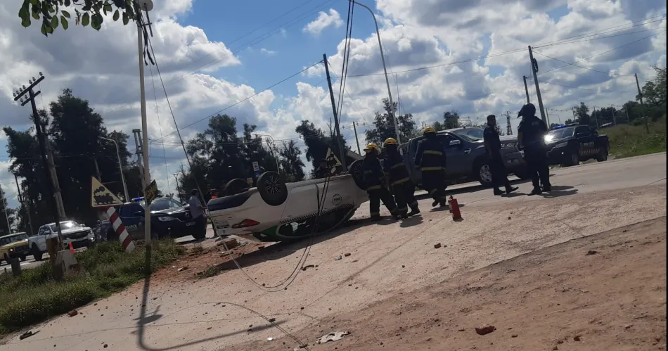 A causa de esa maniobra, el remisero chocó contra un poste de cemento del tendido eléctrico y tras el violento impacto volcó, quedando el vehículo con sus cuatro ruedas hacia arriba y ambos ocupantes atrapados en su interior.